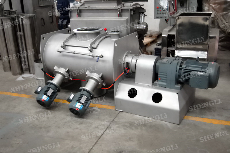 工作原理:犁刀式混合機采用臥式圓柱筒體,內(nèi)設(shè)平行主軸,主軸上安裝若干犁式刀頭,通過較快的旋轉(zhuǎn)速度,分割、重合物料,實現(xiàn)快速攪拌的功能,常結(jié)合1500-3000轉(zhuǎn)高速剪切飛刀相互作用。