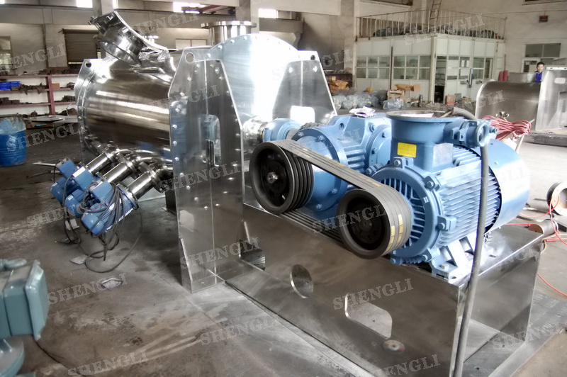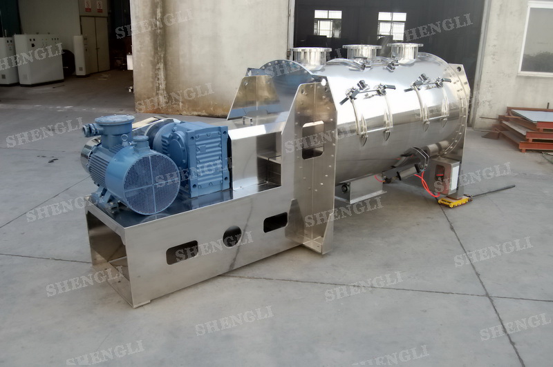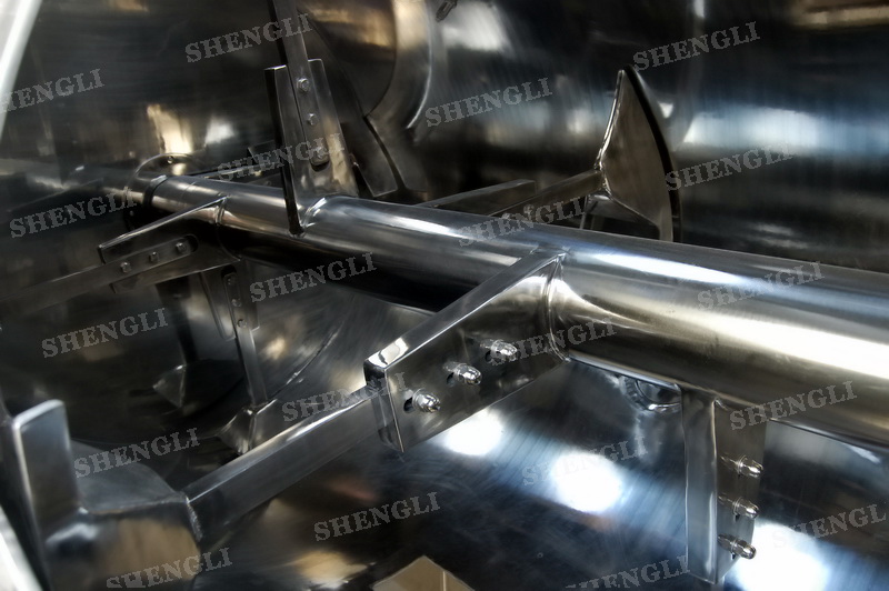 工作原理:犁刀攪拌機(jī)采用臥式圓柱筒體,內(nèi)設(shè)平行主軸,主軸上安裝若干犁式刀頭,通過(guò)較快的旋轉(zhuǎn)速度,分割、重合物料,實(shí)現(xiàn)快速攪拌的功能,常結(jié)合1500-3000轉(zhuǎn)高速剪切飛刀相互作用。